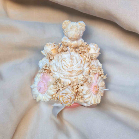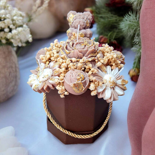 Aranjament flori bej si ursulet ceara cu foita de aur, Flowerbox
