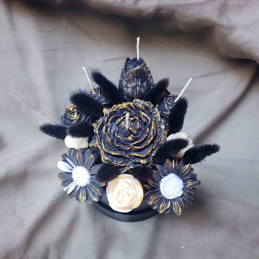 Aranjament flori negre cu auriu din ceara de soia si flori uscate naturale