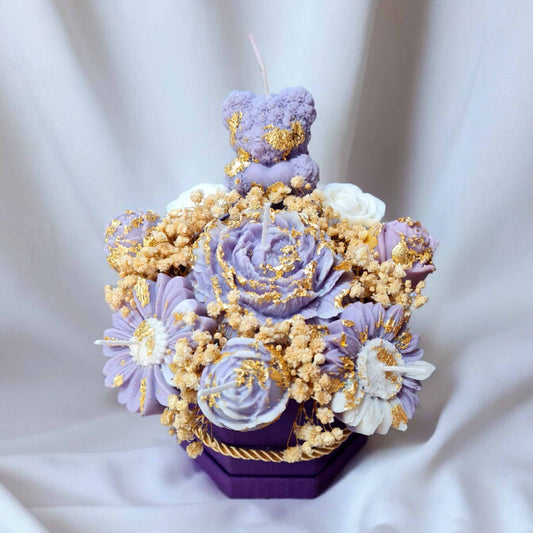 Aranjament flori mov si ursulet ceara cu foita de aur, Flowerbox