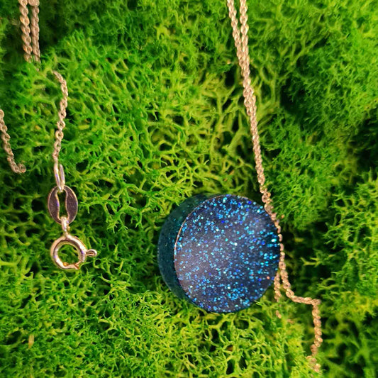 Pandantiv Rasina Epoxidica si Lantisor de Argint, Rotund, Albastru cu sclipici