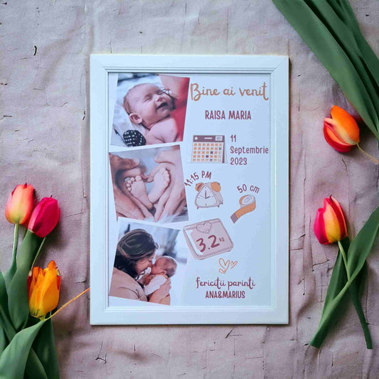 Tablou personalizat cu datele bebelusului la nastere, 3 poze, rama alba