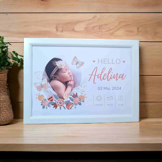 Tablou personalizat cu date bebe la nastere, fetita, rama alba