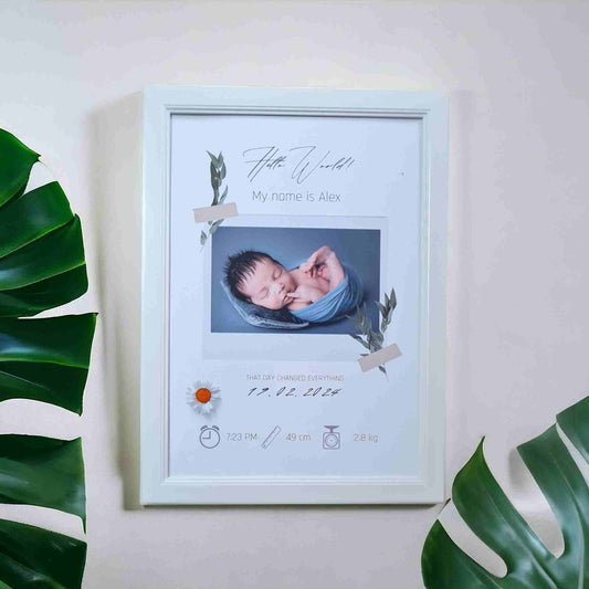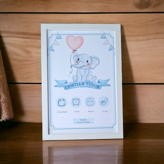 Tablou personalizat cu date bebe la nastere, baiat, rama alba